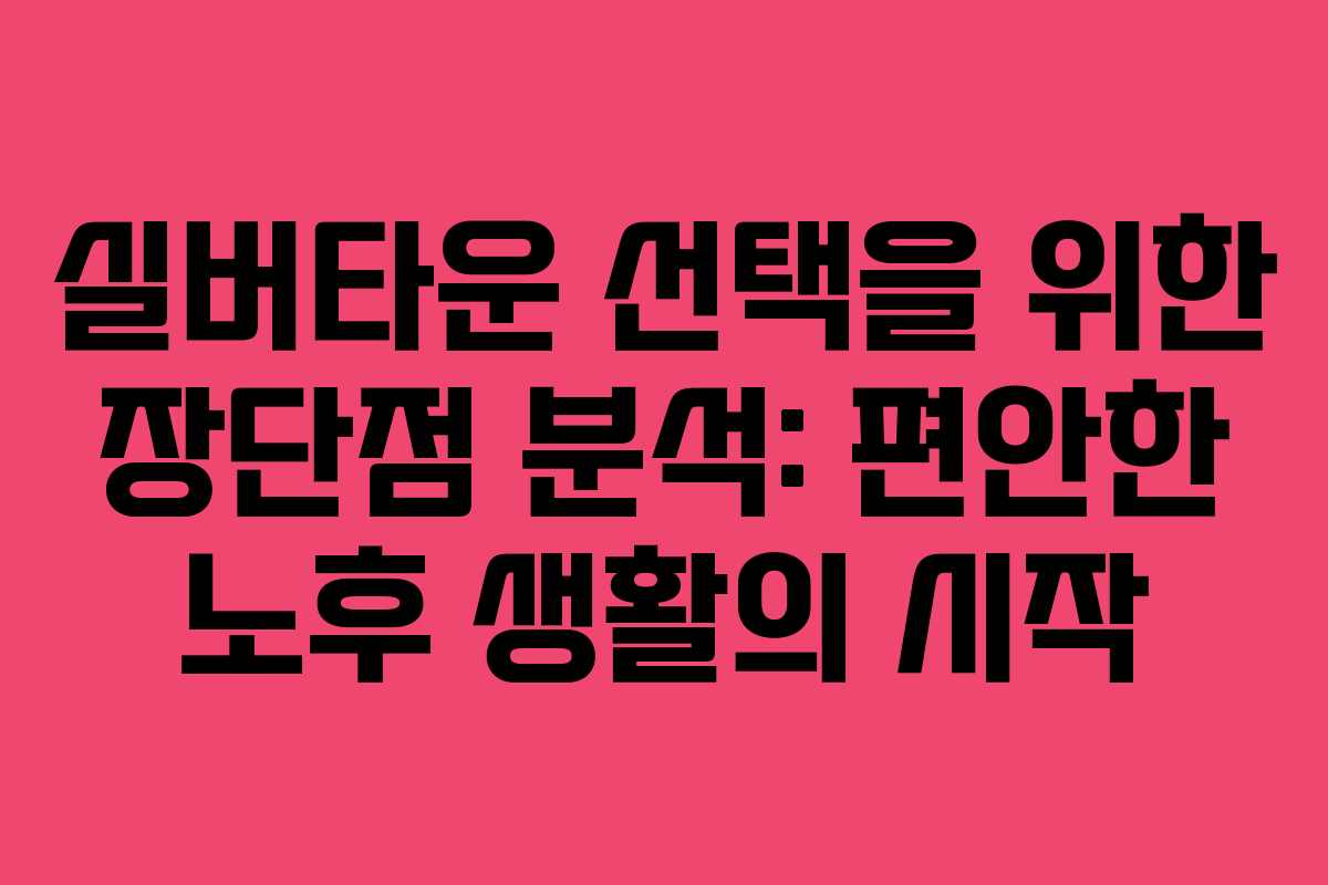 실버타운은 고령자들에게 매우 유용한 주거 형태로, 안정적인 노후 생활을 지원하는 장점이 있다. 그러나 비용과 자율성의 제한 등 단점도 존재하므로 신중한 선택이 필요하다. 각 실버타운의 특징과 장단점을 잘 비교하고, 개인의 생활 스타일과 요구에 맞는 실버타운을 선택하는 것이 중요하다. 이러한 결정은 노후 생활에 큰 영향을 미치므로 충분한 정보와 고민이 필요하다.