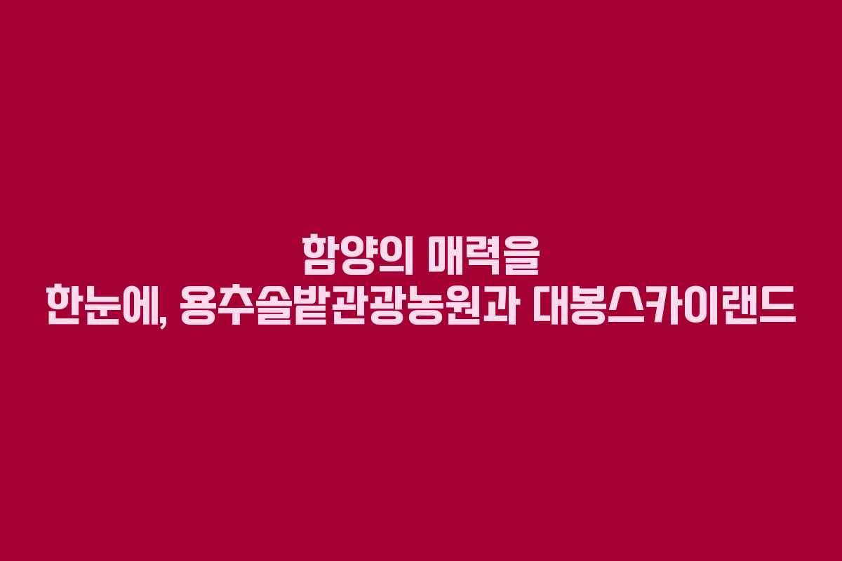 2026년 기준으로 함양 지역의 인기 관광 명소를 소개한다. 이곳은 자연과 함께하는 힐링과 액티비티를 동시에 즐길 수 있는 공간으로, 특히 용추솔밭관광농원과 대봉스카이랜드는 꼭 방문해야 할 장소다.