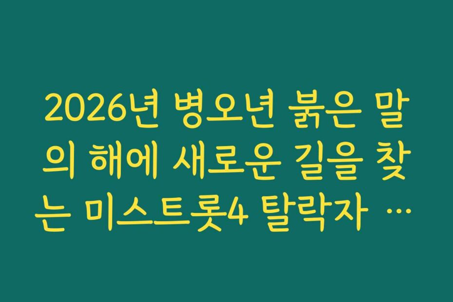 혹시 이런 고민 있으신가요. 2026년 병오년 붉은 말의 해에 새로운 길을 찾는 미스트롯4 탈락자 행보 응원에 대해 알고 싶다면, 이 글이 도움이 될 것입니다. 2026년의 변화와 함께 미스트롯4 탈락자들이 어떤 새로운 기회를 찾고 있는지 알아보세요.